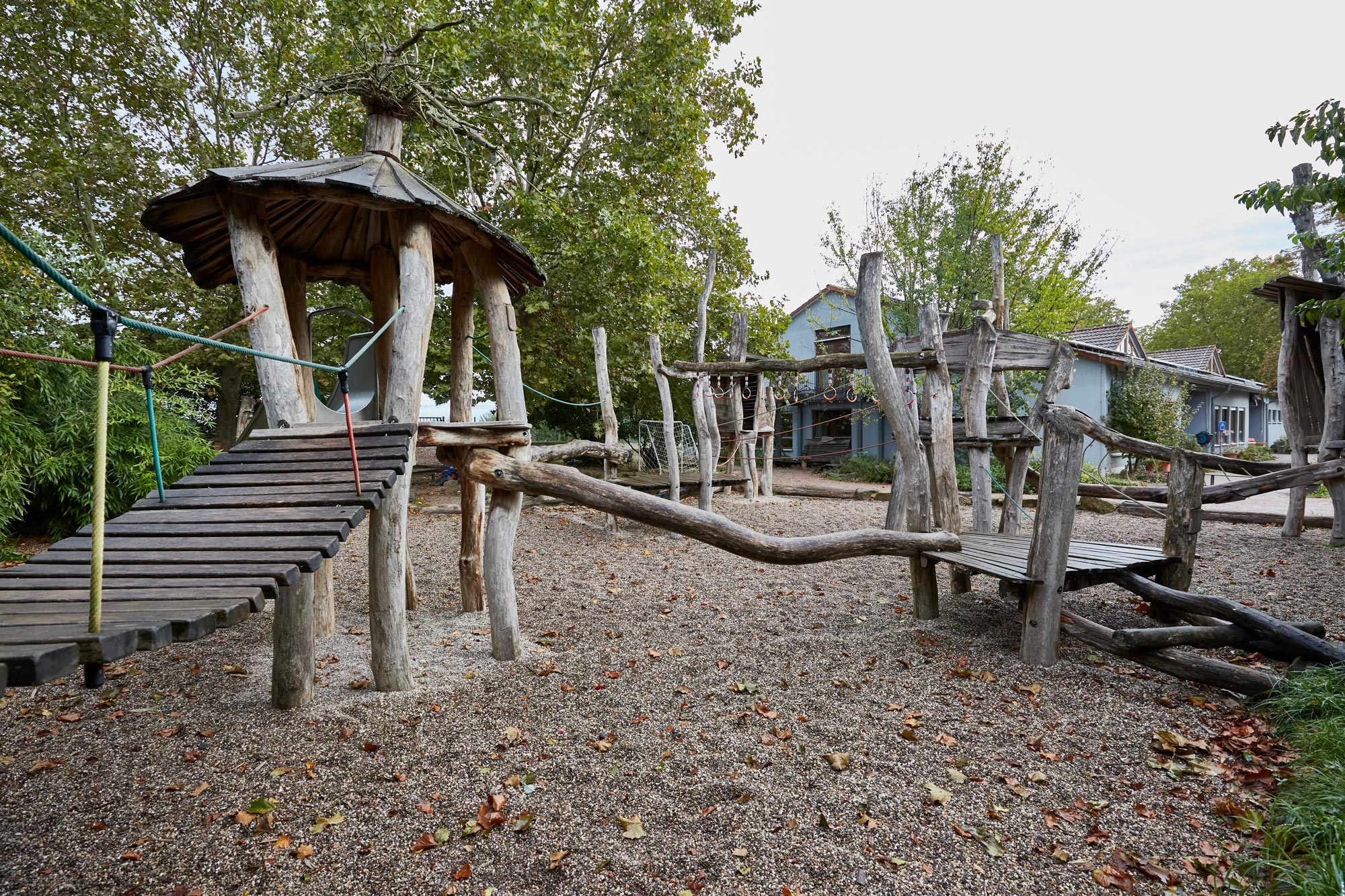 Wir sind stolz auf ein naturnahes Außengelände, in dem die Kinder toben, sich ausprobieren, gärtnern und ernten. Es wurde mit großem Engagement von Eltern, Beschäftigten und Freiwilligen der Ortsgemeinde, unter der Planung und Anleitung des Vereins Natur Spur e.V. gebaut. In unserer Frischküche wird Frühstück zubereitet und mittags regional gekocht.