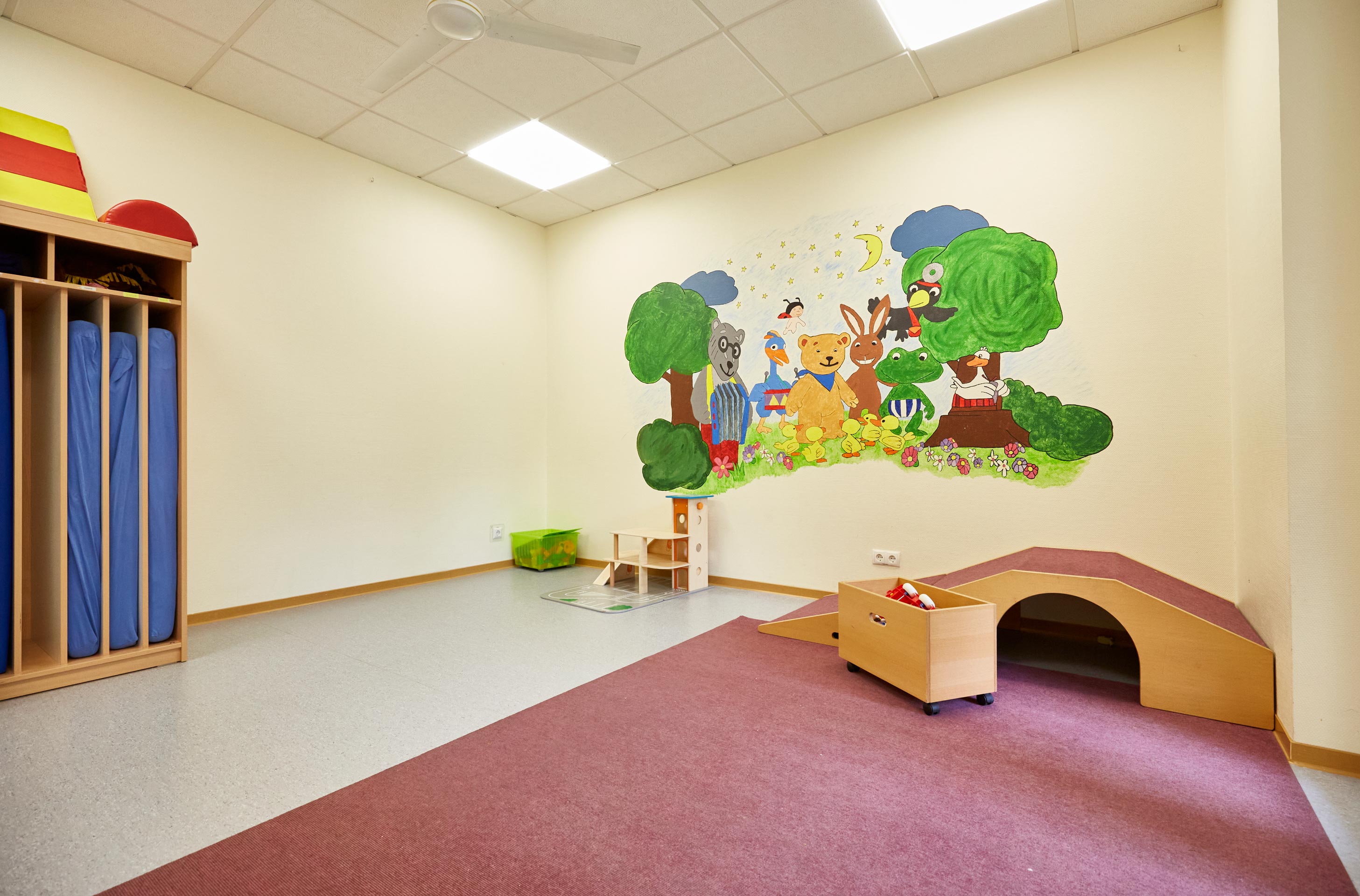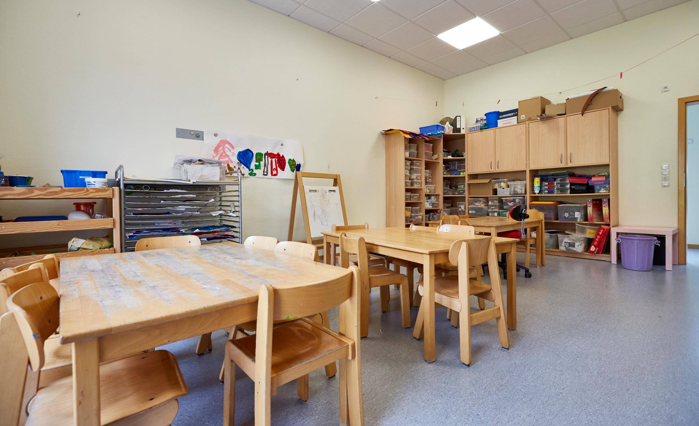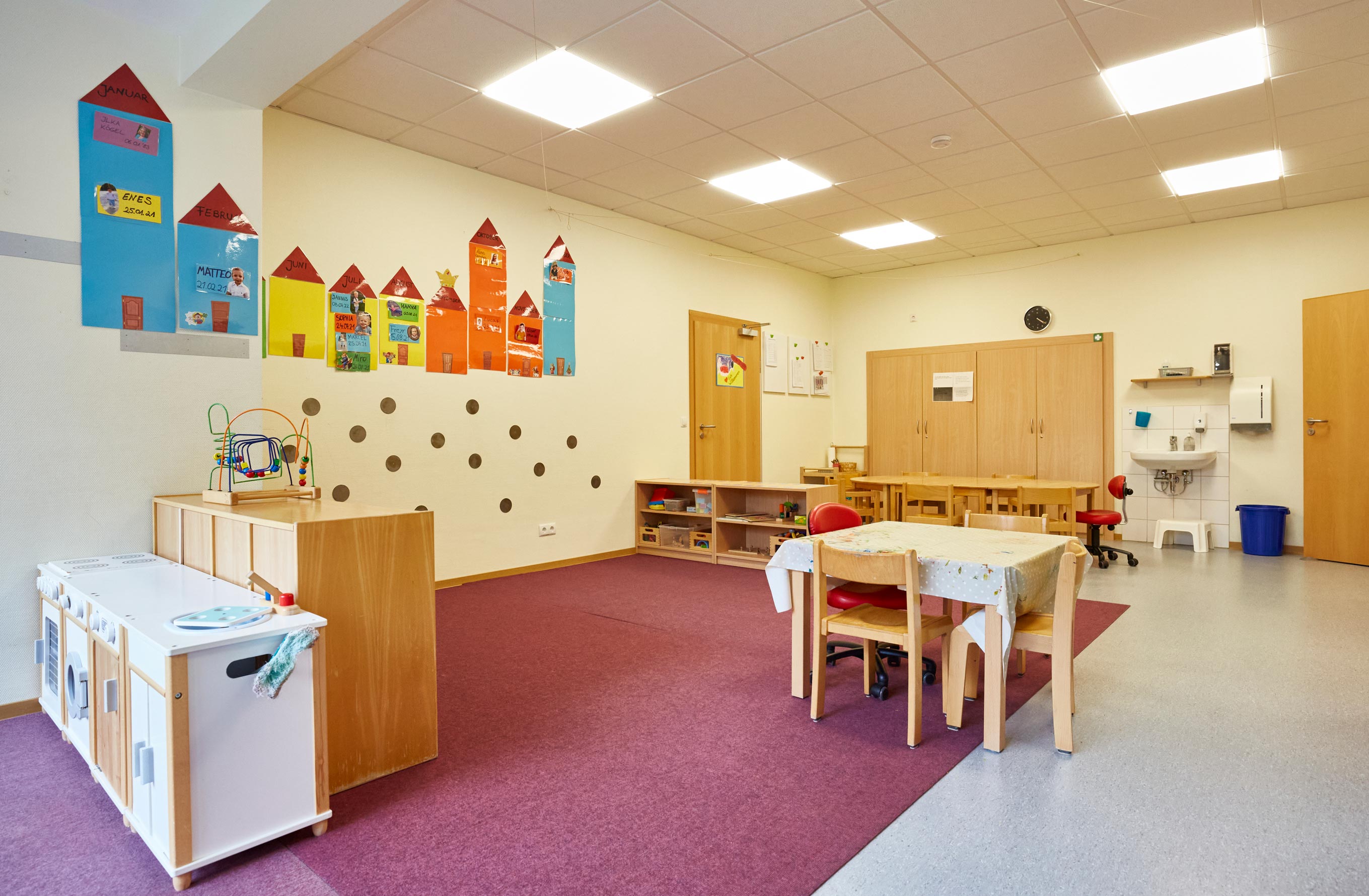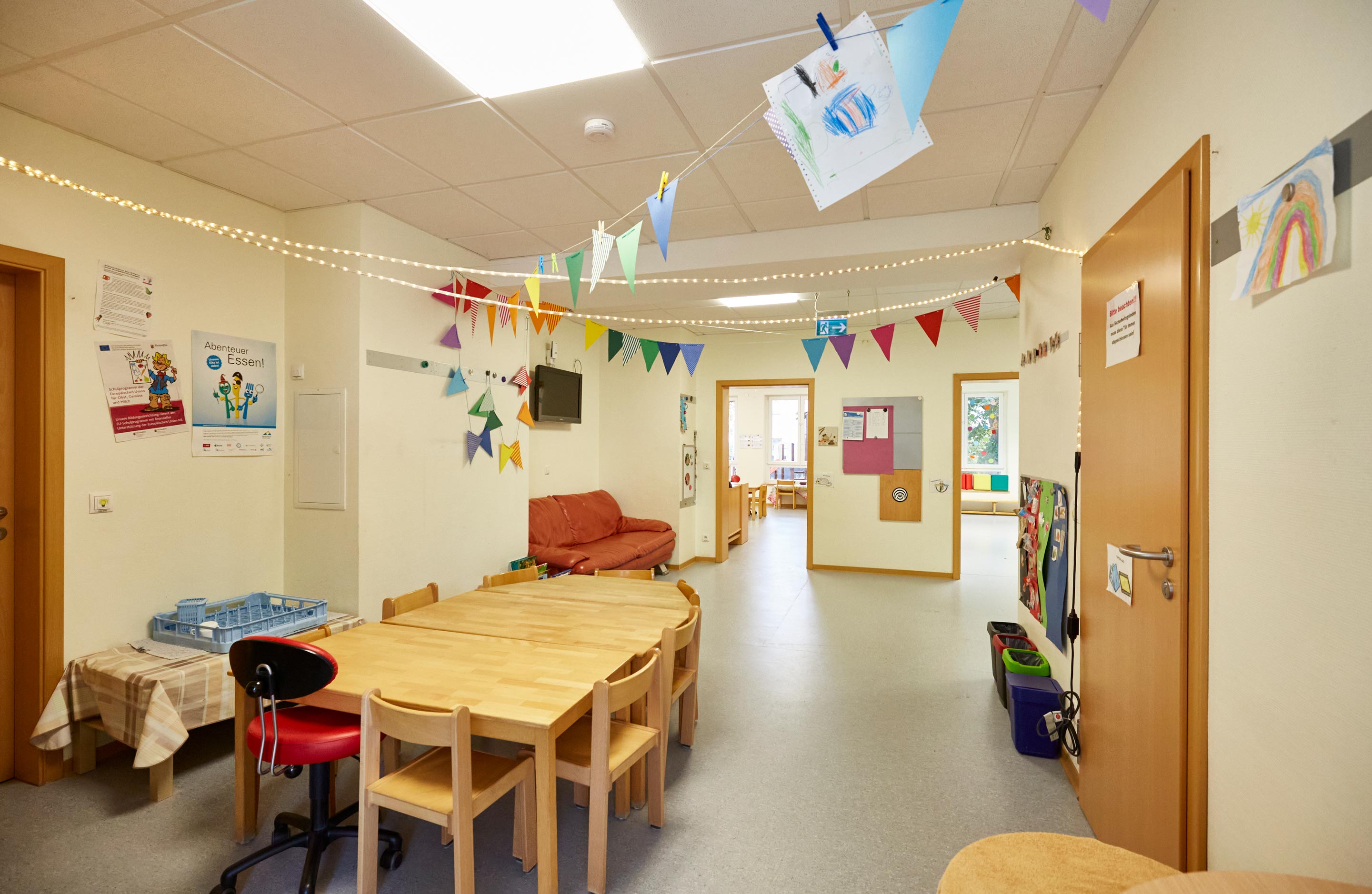 In den Gruppen-, Neben- und Schlafräumen sowie Kreativ- und Bewegungsbereich wird gespielt, gelernt, geturnt, geschlafen und gegessen. Wir kochen täglich frisch und achten dabei auf die aktuelle Empfehlung der Deutschen Gesellschaft für Ernährung. Durch den direkten Kontakt zur Hauswirtschaftskraft lernen unsere Kinder auf natürliche Weise erste Grundlagen rund um Ernährung und Küche.