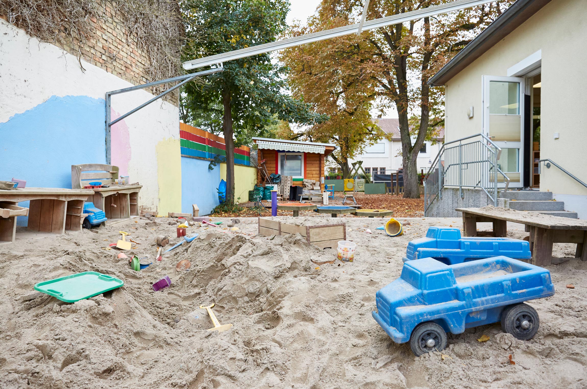 Unser naturnahes Außengelände unter alten Kastanien bietet den Kindern viel Platz zum Spielen, Entdecken und Erleben. Dort können sie sich frei bewegen, mit allen Sinnen die Natur erfahren und sich (fast) täglich draußen aufhalten – unabhängig vom Wetter.