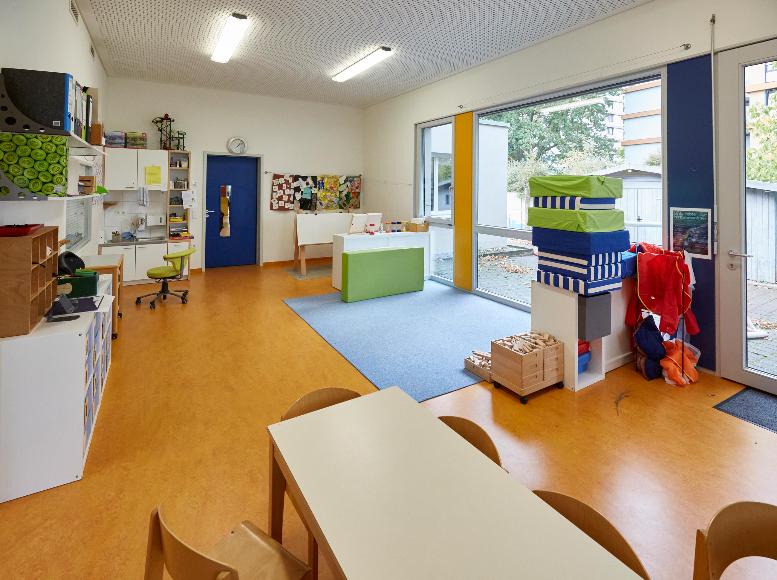 Zu unserem Schwerpunkt zählt zum einen die Vorschularbeit. In einer festen Projektgruppe treffen sich die Kinder und gestalten ihr letztes Jahr im Kindergarten selbstbestimmt mit einer begleitenden Fachkraft. Hierbei werden Themen wie der Gartenführerschein, Erste-Hilfe-Projekt, das Zahlenland und das Thema Nachhaltigkeit behandelt. Zum anderen essen die Kinder bei uns gemeinsam in der Mensa. Das Mittagessen wird von zwei Hauswirtschaftskräften täglich frisch zubereitet.