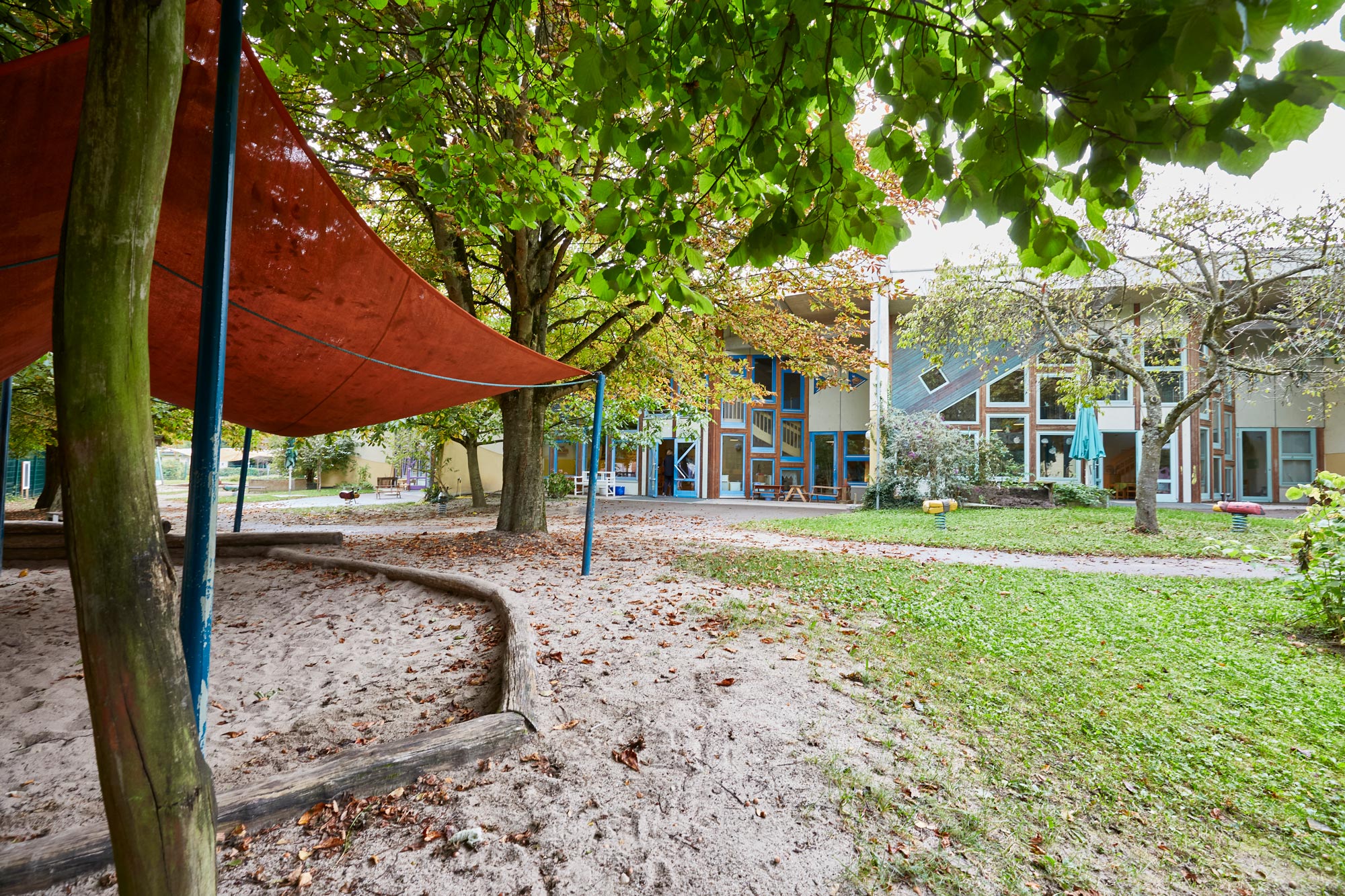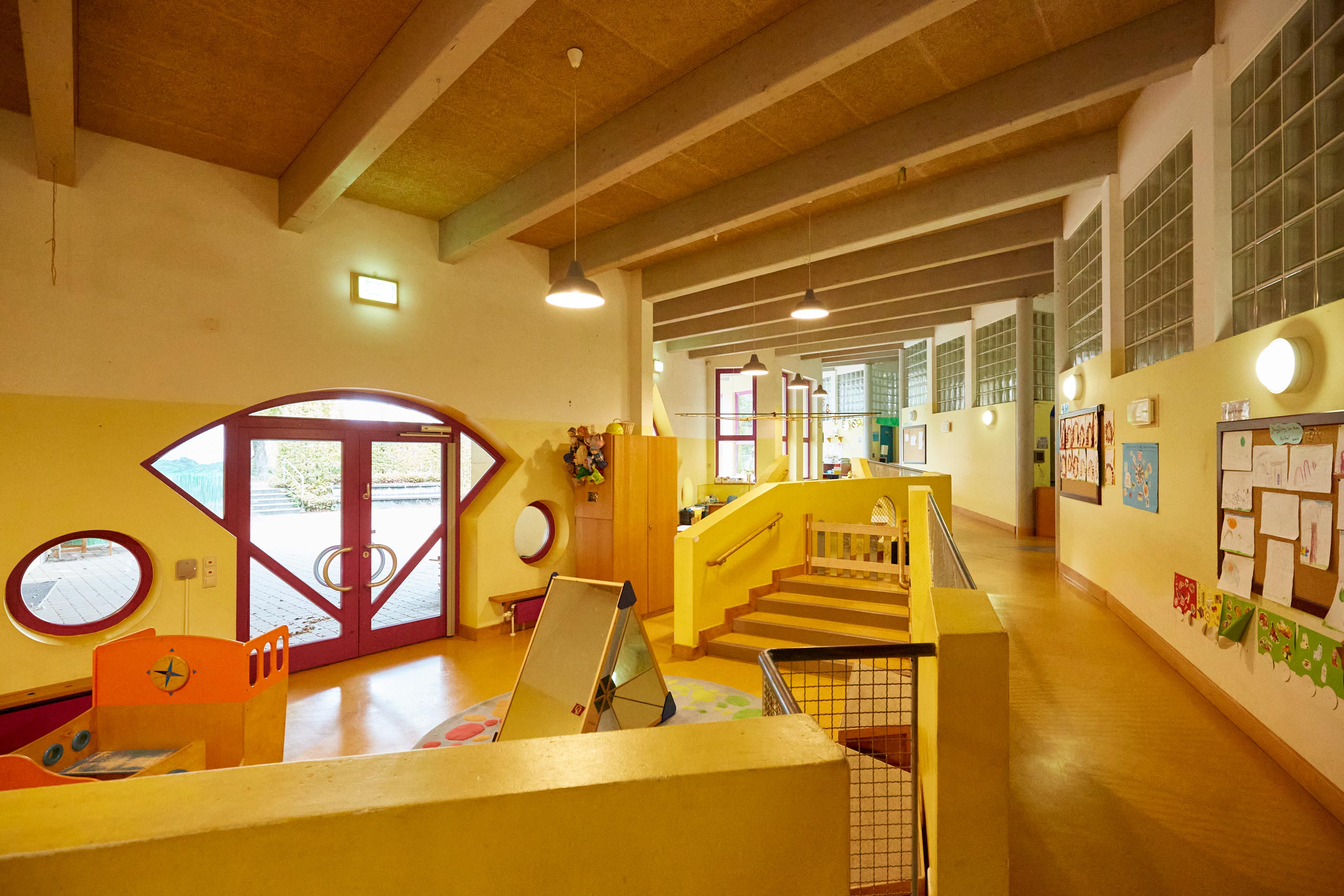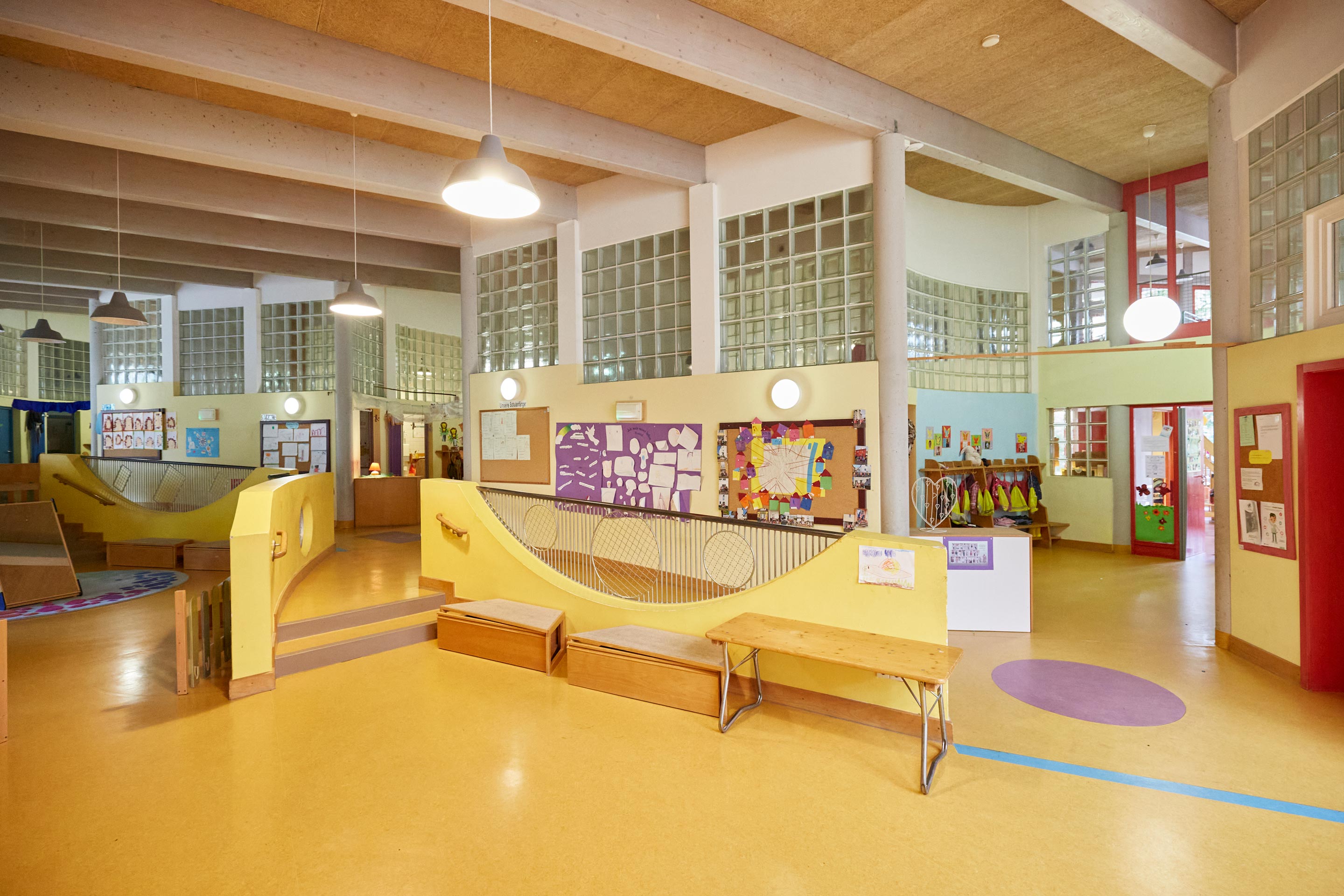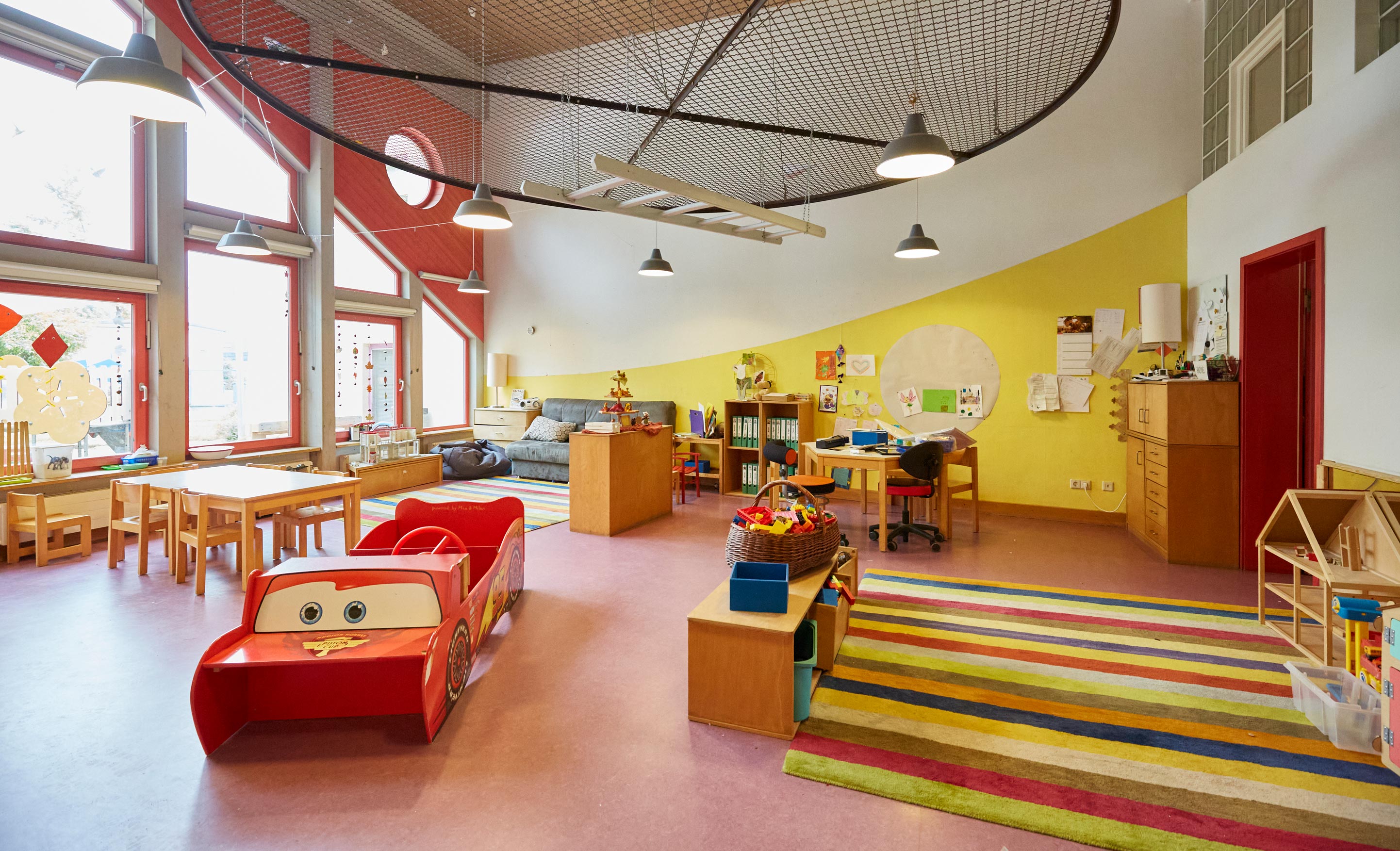 Unsere Kita hat sehr viel Platz und Spielflächen auf den Fluren einer höherliegenden Galerie und an versteckten Ecken, denn ein Architekt hat sie in den 1990er-Jahren entworfen. Rind um unsere Villa liegt ein riesiges Außengelände direkt neben der Grundschule. In unseren kreativen Räumen spielen, turnen, lernen und schlafen die Kinder. Alle Kinder essen bei uns zu Mittag.