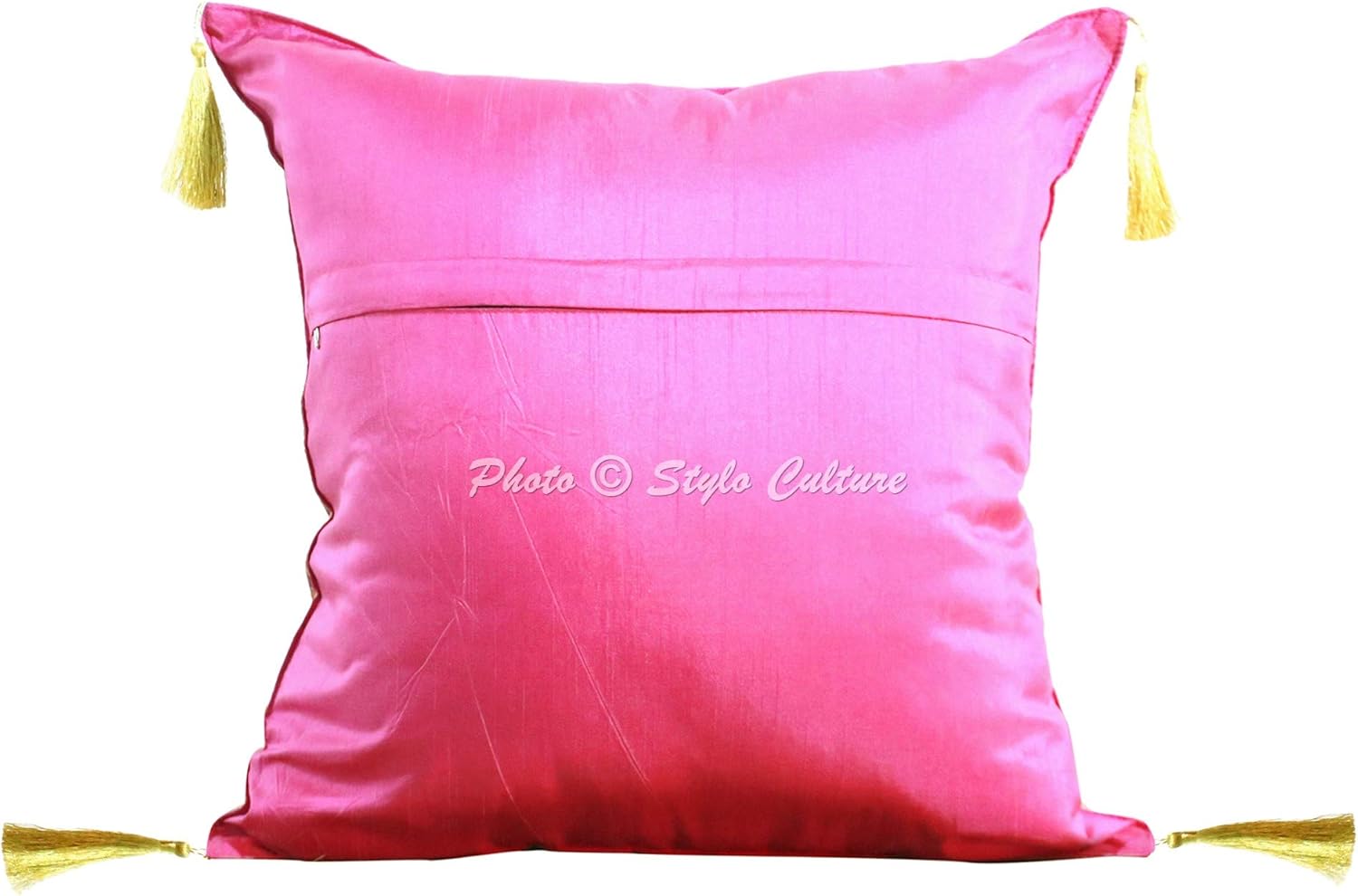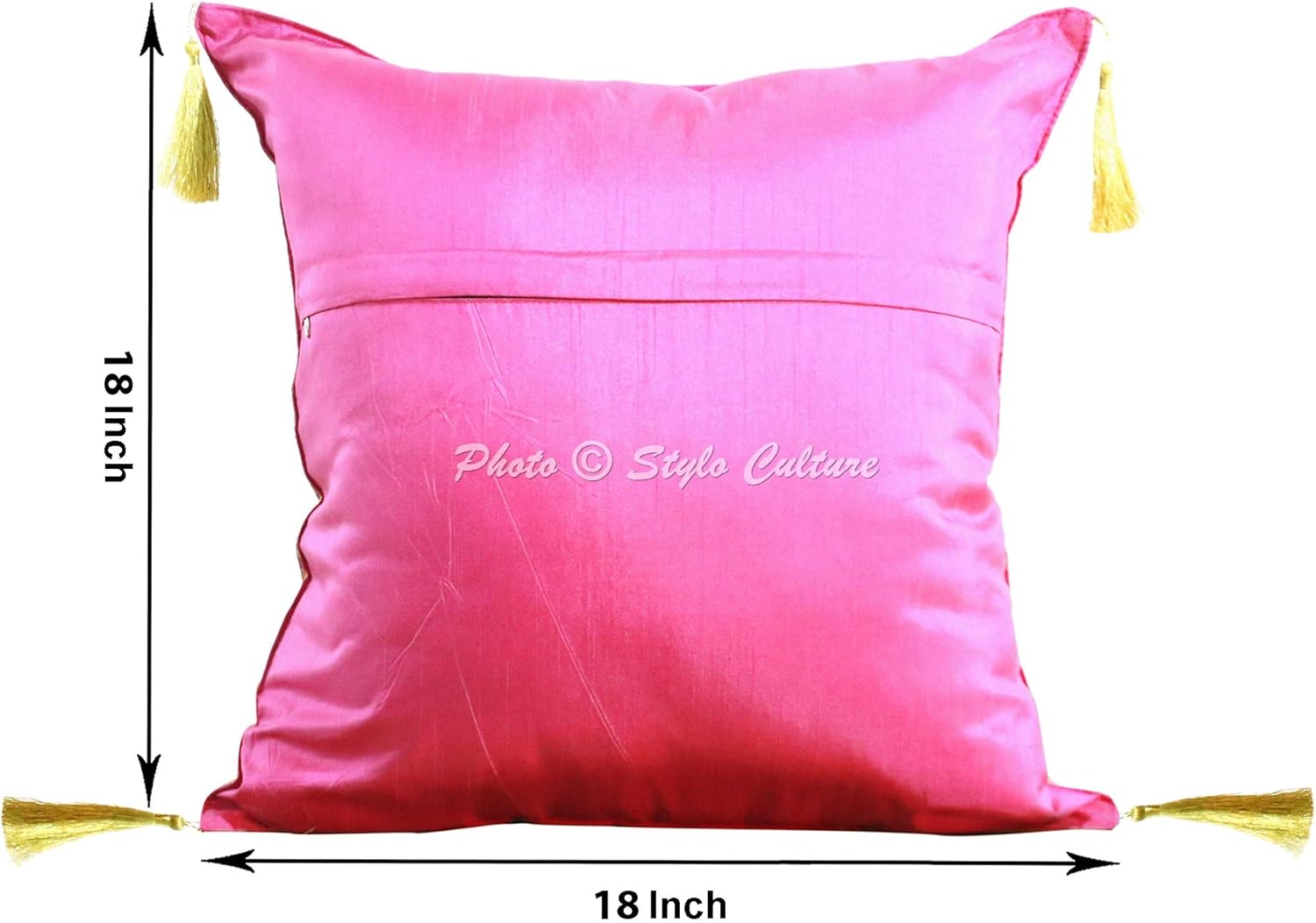 Stylo culture presents luxurious and trendy jacquard weave with brocade border & tassels throw pillow cushion covers. Stylo Culture brocade jacquard cushion cover in a range of various beautiful colours and patterns are designed to fit into any home decor interior settings and almost all colour schemes. Let your sofas and couches get acquainted to the sumptuous luxurious comfort of these small stack of comfort dressed in pretty covers. Every corner and dimension of these cushion covers don't fail to surprise you with their appeal. These cushion covers showcase heavy golden tassels on all four corners and adds up to the beauty of the cushion covers. The cushion covers are in size 18x18 inches (45x45 cm). These are magenta pink & gold colored throw pillow covers and can be used in multiple ways - be it sofa cushions, bed throw pillows, scatter cushion covers, decorative pillows, living room decoration, bedroom decoration etc. The sales package comprises of 4 throw pillow cushion covers in peacock & floral patterns. PLEASE NOTE THE SALES PACKAGE INCLUDES ONLY CUSHION PILLOW COVERS AND DOES NOT INCLUDE FILLER INSERTS.