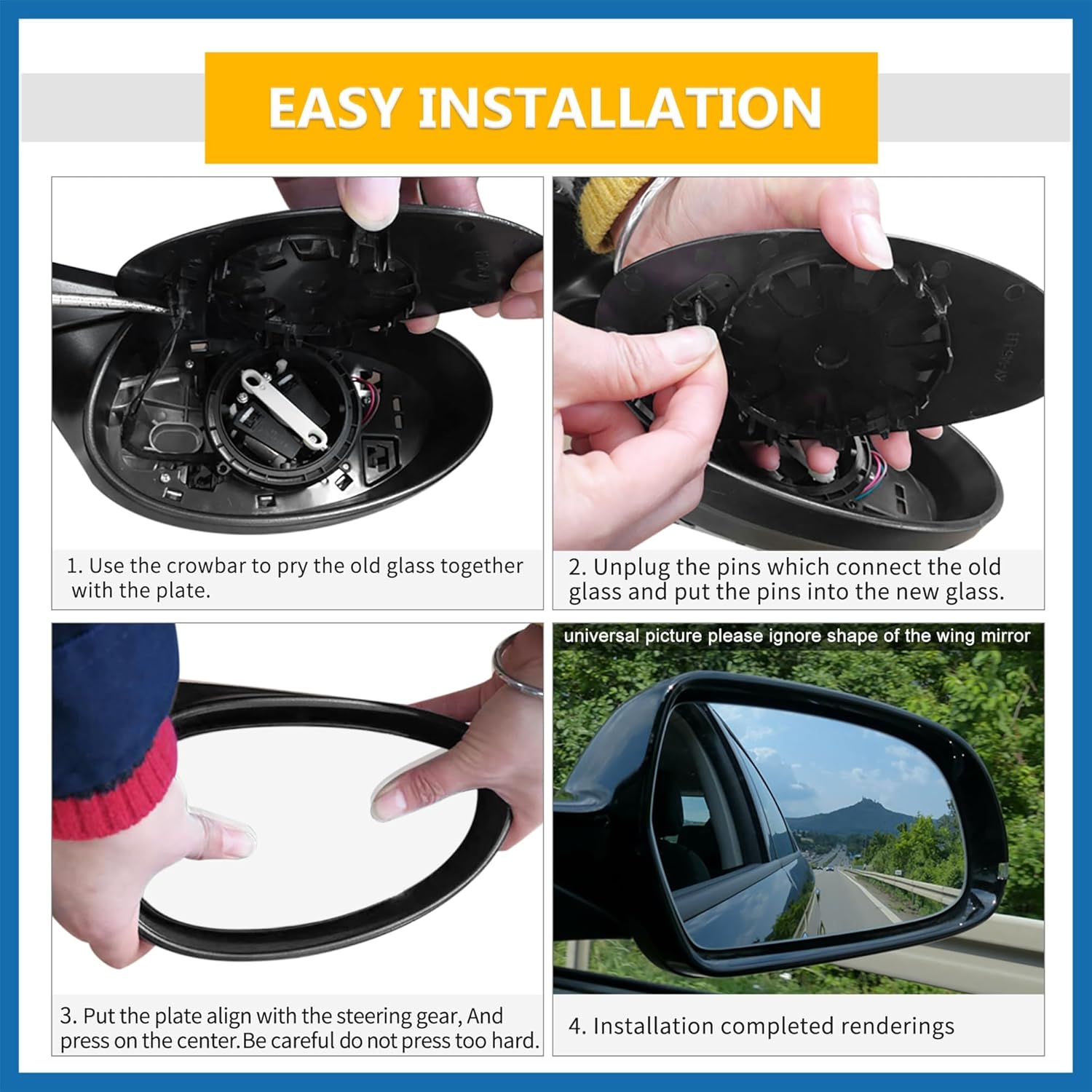 Feature:The rearview mirror glass does not have the auto dimming function.Note: Before you buy, please check the shape and size carefully to make sure this item will fit your car.The rearview mirror glass is for power operation mirrors.Made of Real glass, the rearview mirror glass includes a backing plate.Direct replacement for your old ones.This is a non-OEM product, accessory only!Specification:Material: Real GlassGlass Color: WhitePlacement on Vehicle: LeftMirror Adjustment Method: PowerType: Mirror GlassDiagonal Measures: 23.5cm / 9.25"Pin Number: 2 Pins Fitment:for Hyundai santa fe 2013-2016Installation Steps:Use a tool to pry the old glass together with the plate.Unplug the pins which connect the old glass.Put the pins into the new glass.Put the plate align with the steering gear, and press it on the center.Package Includes:1 pc Left Driver Side Mirror Glass Replacement