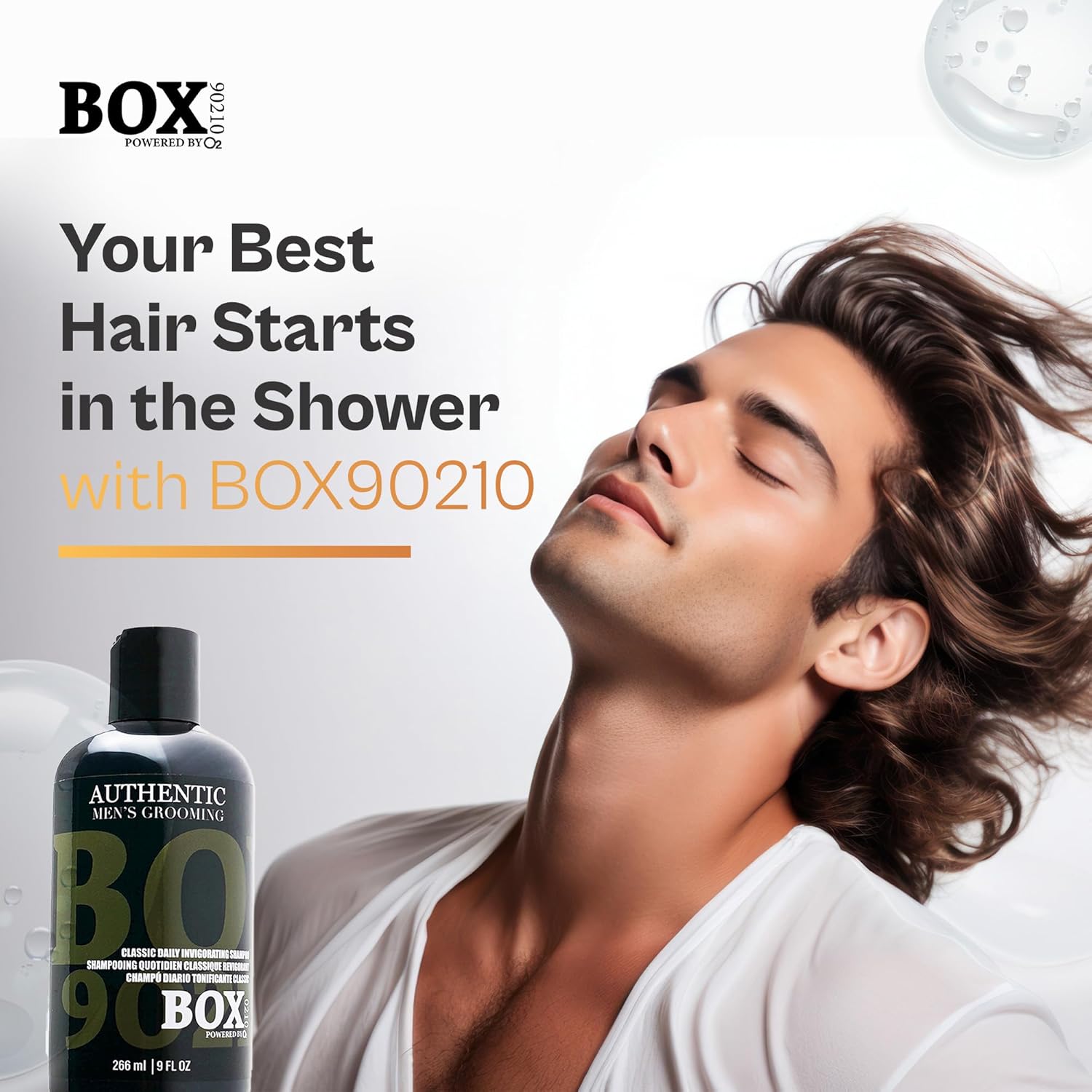 The BOX90210 Classic Invigorating Daily Shampoo is expertly crafted for the modern man who values freshness, performance, and simplicity in his grooming routine. This energizing daily shampoo provides a deep, purifying cleanse that effectively removes dirt, sweat, excess oil, and product build-up, making it ideal for active lifestyles, gym-goers, and anyone who wants consistently clean and refreshed hair. Infused with an invigorating blend of tea tree and menthol, this formula awakens the senses while delivering a cooling, stimulating experience directly to the scalp. Tea tree helps purify and refresh, while menthol provides an energizing dose of coolness that leaves your hair and scalp feeling revived after every wash. Together, they create a balanced formula that cleans powerfully without over-drying. This shampoo is designed to maintain your hair’s natural strength and resilience. While it gives a thorough cleanse, it also works to preserve essential moisture, preventing your hair from becoming brittle or stripped. The result is hair that feels strong, healthy, and naturally full, ready to style and withstand daily routines. Versatile and effective, the Classic Invigorating Shampoo works well for all hair types, including straight, wavy, curly, thick, fine, oily, and combination hair. Its lightweight formula ensures a non-greasy finish, making it an excellent choice for daily use. Whether you style your hair or prefer a natural look, this shampoo leaves your strands clean, refreshed, and manageable. With its reliable cleansing power, refreshing botanicals, and hair-strengthening formulation, the BOX90210 Classic Invigorating Daily Shampoo elevates your grooming routine, offering the perfect blend of daily cleanliness, scalp refreshment, and long-lasting hair health.
