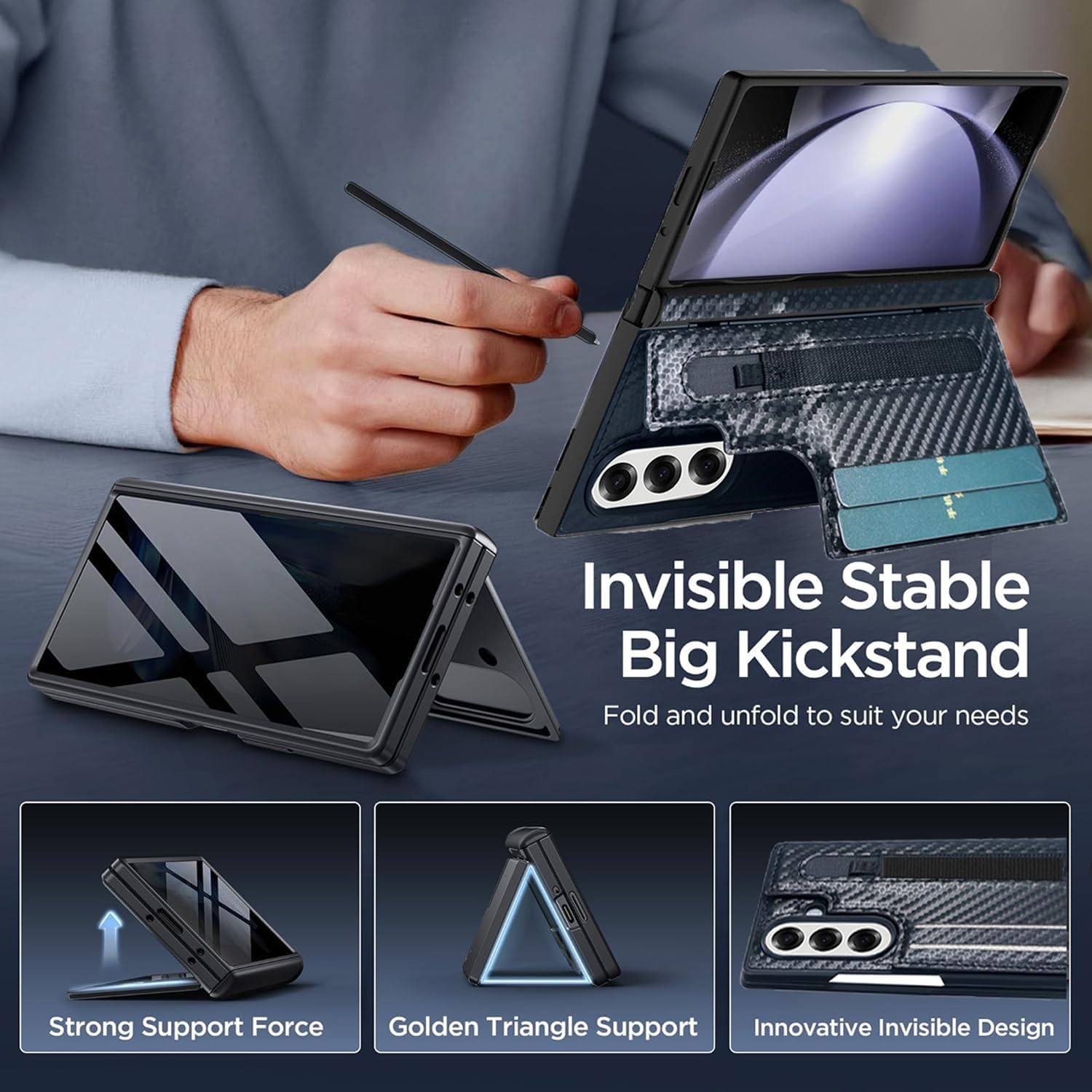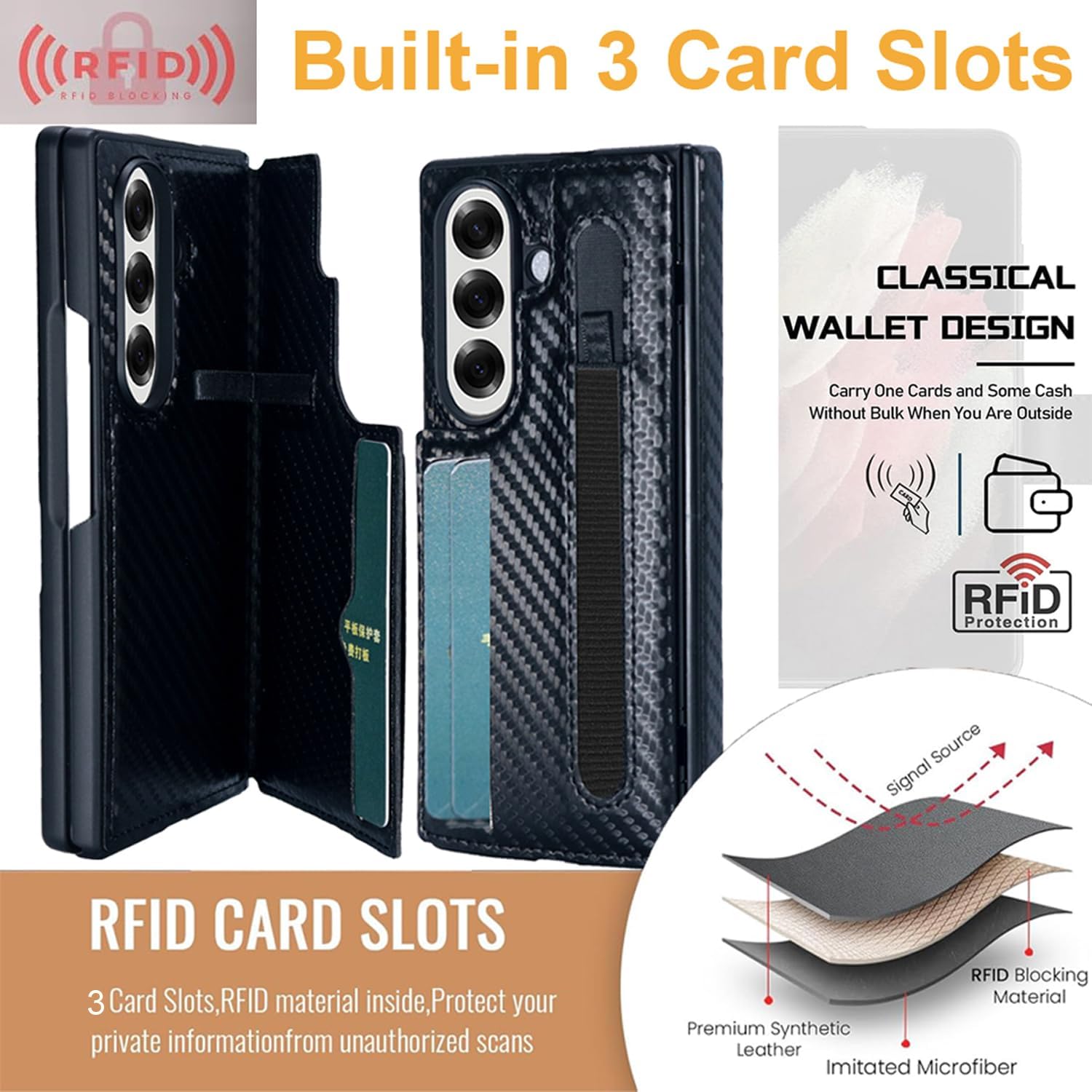 | Additional Features | (1) Built-in elastic S-Pen holder; (2) Luxury Carbon Fiber Leather Case; (3) Built-in spring hinge protection; (4) Built-in 3 Card Slots; (5) Kickstand function; (6) RFID shielding technology; (7) Heavy Duty Protection; (8) Built-in Screen Protector |