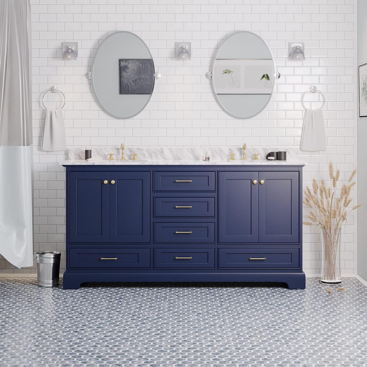 This item is shipped via freight and will be delivered curbside. Please visit our Amazon seller profile for more information.Kitchen Bath Collection specializes in producing designer bathroom vanities, handmade by skilled artisans using quality materials and high-end construction methods.This fully assembled bathroom vanity set features a furniture-grade cabinet, stunning countertop, and 2 ceramic sinks.Pictured faucet/pop-up drain not included.Countertop is pre-drilled for two 8" widespread 2-handle faucets (not included).Please note that the product height includes the height of the backsplash, which is 4 inches.