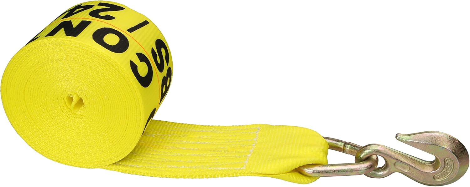 This 4" Yellow Winch Strap with Grab Hook from US Cargo Control is a strong cargo strap for trucks and trailers that work to safely secure hauling equipment or other building materials. Each winch strap measures 27' (324") in length for plenty of tie down webbing without having too much excess for the trailer winch, and measures 4" wide to fit into any standard winch for adjustment. These cargo straps are made of durable, weather-resistant polyester webbing that can tie down working loads of up to 5,400 lbs. and have a breaking strength of 20,000 lbs. Our 4 inch straps are fitted with zinc-coated grab hooks that resists rust and corrosion and can hook onto 3/8-inch chain for secure attachment. The trailer winch strap meets the necessary safety compliance requirements set by the Department of Transportation (DOT) and Web Sling & Tie Down Association (WSTDA) and comes with working load limit tags for security. Add this Grab Hook Winch Strap from US Cargo Control to your existing winch accessories and make the cargo tie down process much safer and easier.